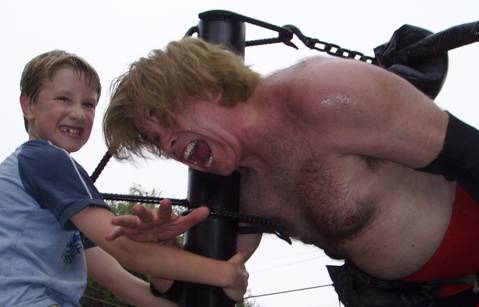 whispered, “Okay, now reverse the hold.” He did. “Kick the